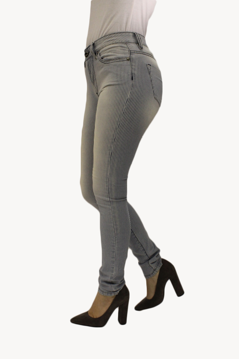 Ψηλόμεσο παντελόνι σε χρώμα λευκό με μπλε ρίγες και στενή εφαρμογή. Μαλακό πανί.